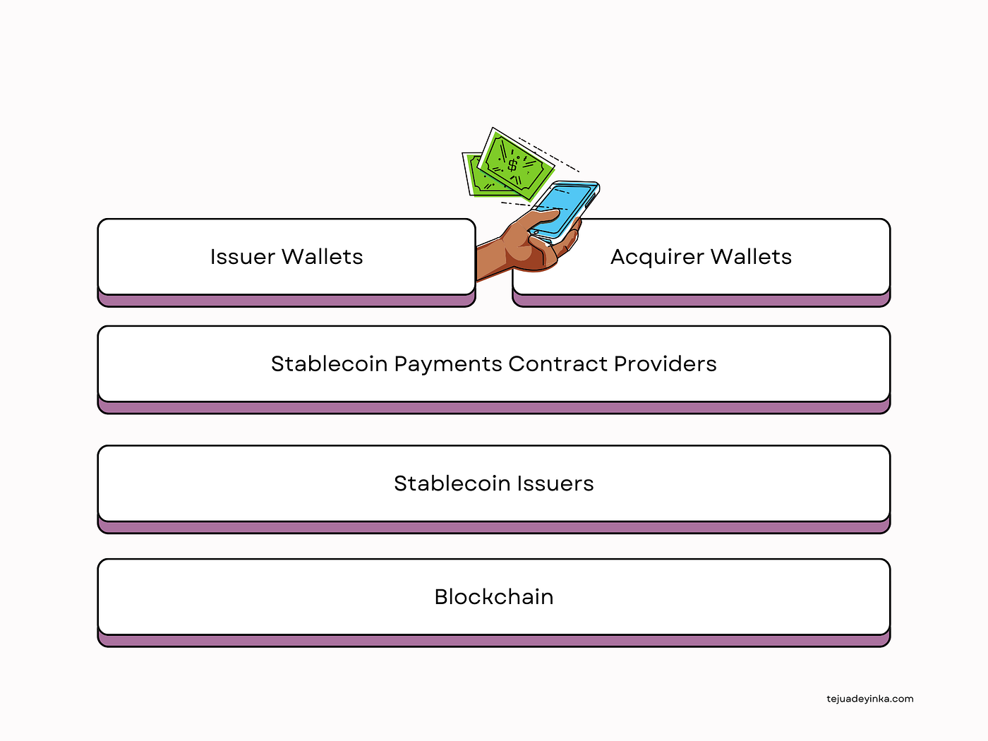I envision the stablecoin landscape evolving to look similar to the card payments stack but with an open network. Rather than direct payments between users, the process would involve senders interacting with the smart contracts of infrastructure providers who would likely be wallets providing this functionality through a simple interface. These contracts would perform the necessary fraud and AML checks and handle tax deductions before forwarding the payment to the recipient’s wallet. Merchants will have wallet providers who will act as acquirers that provide them value-added services e.g. the ability to take loans, a pretty payment page with tech to easily accept crypto transfers etc.